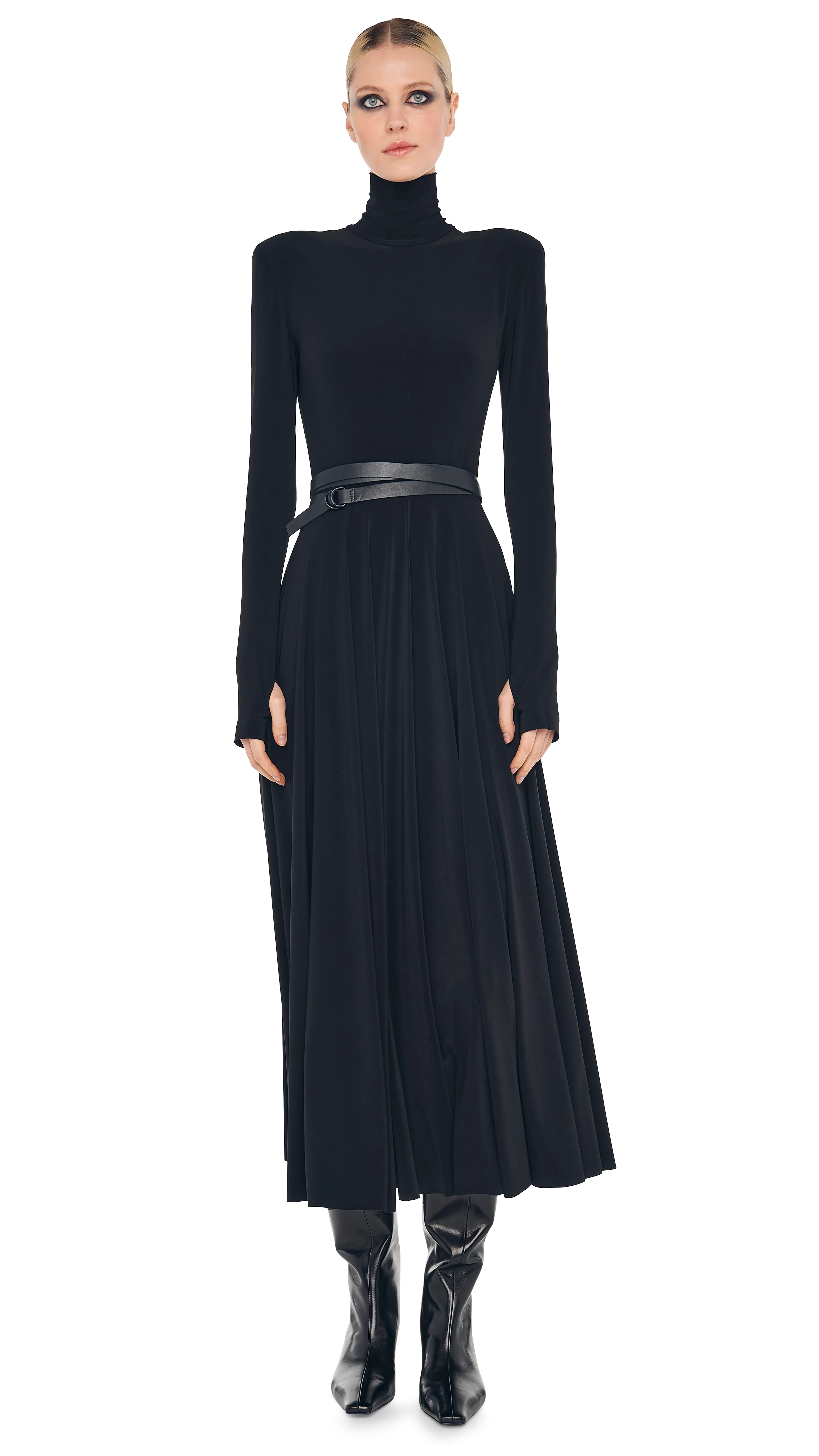 LONG SLEEVE SHOULDER PAD TURTLE FLARED DRESS TO MIDCALF